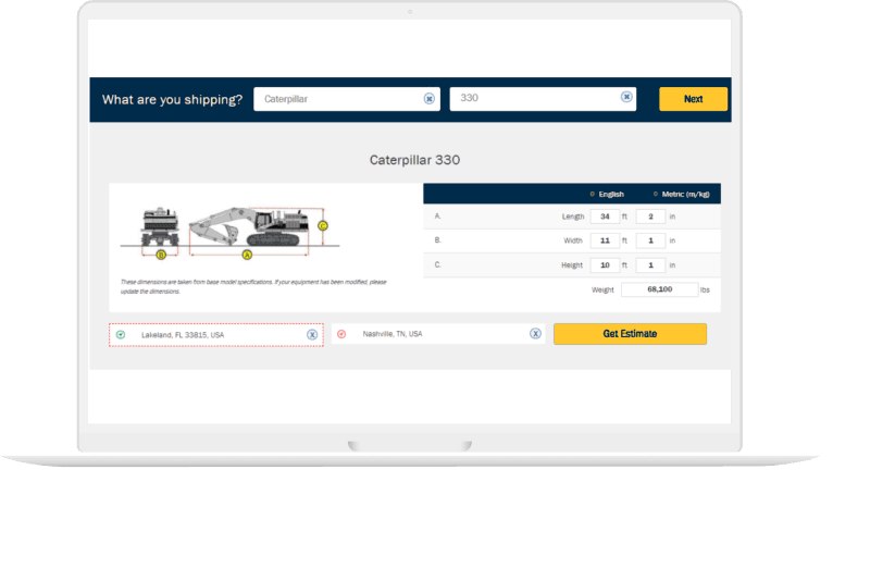 Our Freight Estimator tool makes a complex process simple. With only a few clicks, you are provided machine diagrams, specs, and instant freight estimates. Just provide you asset’s detail and drop-off location and the rest is taken care of.